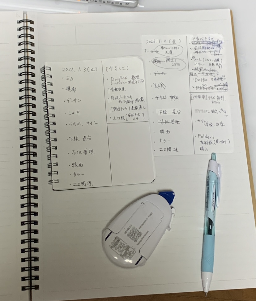 んで、1日を終えたらそれを切り離して別途で使用している日報ノートの見開きページに貼り付けていくわけね。