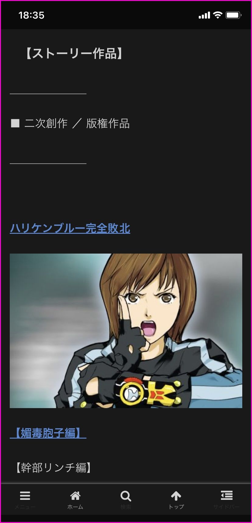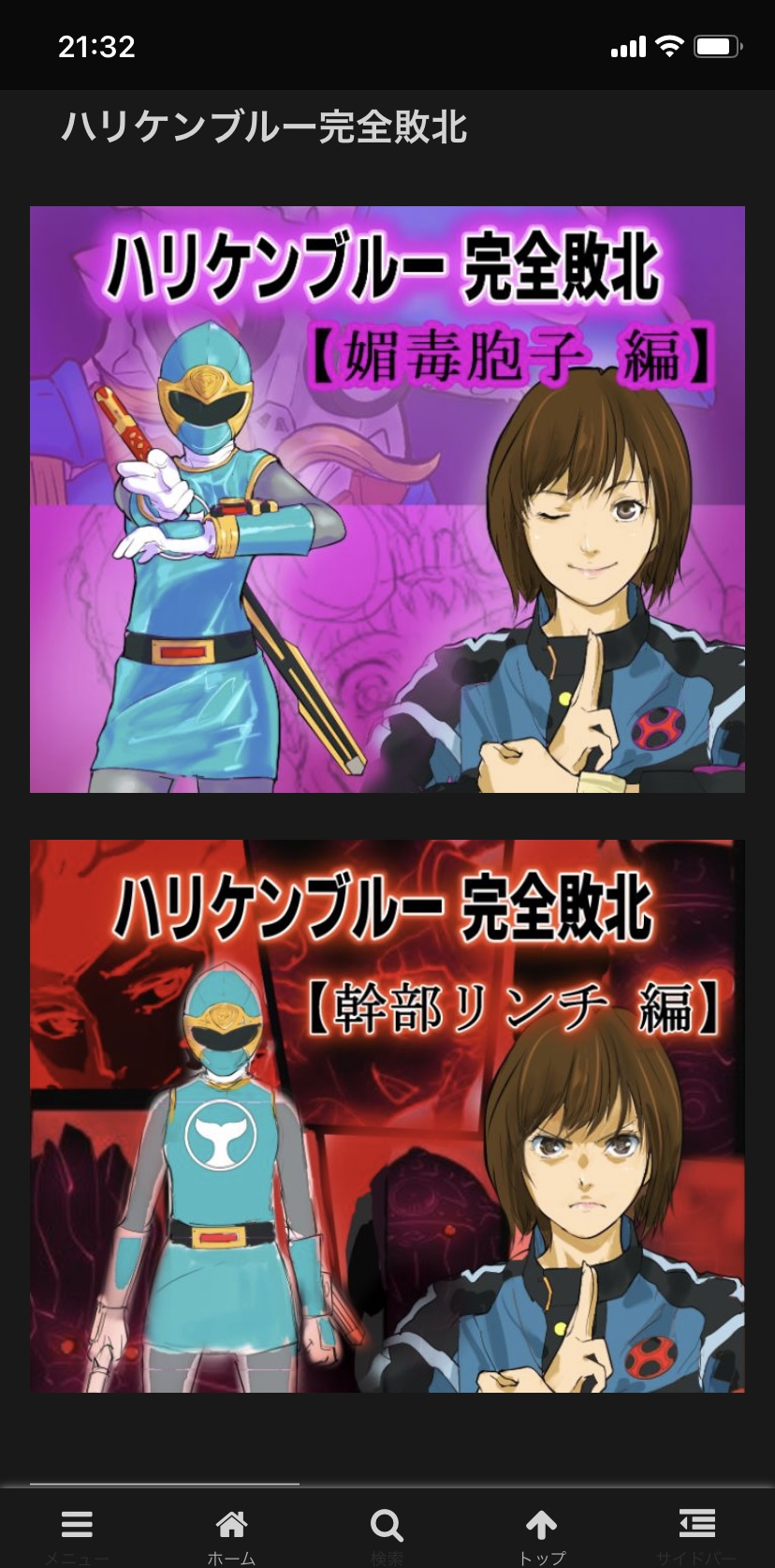 【ストーリー作品】のメニューから『ハリケンブルー完全敗北』のコンテンツで、挿絵サンプルを数点 見ることができるところまでは増築した。